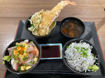 賄い丼、釜揚げしらす丼と地魚入り天丼 18種類のミニ丼から3種を選択するシステム。このメニューのコスパ極めて良し。ただし、最近の私にとっては量が多すぎた。