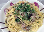 そこでパスタ麺を使うことに.これをリゾットと言うかどうかは別として,米が小麦に変わっただけで,牛乳,ベーコン,とろけるチーズは同じ.これにタマネギとシメジを加えてみた.
