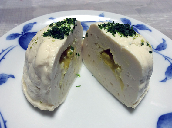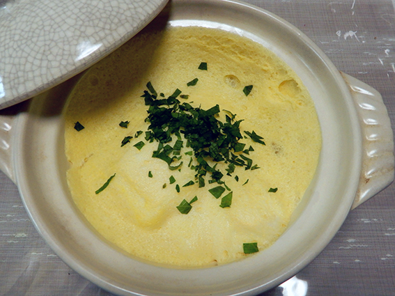 砂糖を入れない黄身入りメレンゲみたいなものが,熱いだ し汁に浮いている料理.