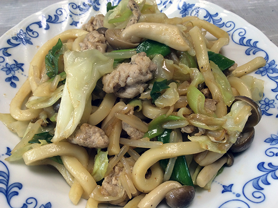 冷蔵庫をみると八丁味噌があったので,味噌焼きうどん.