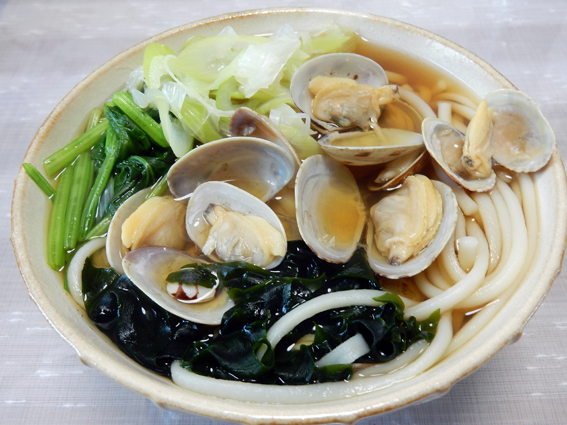 さて,何を食べようかと冷蔵庫やと食料庫をみると,娘達が蒲郡の潮干狩りでとってきてくれたアサリを冷凍したものと,これまた蒲郡金トビ志賀の田舎うどん乾麺.