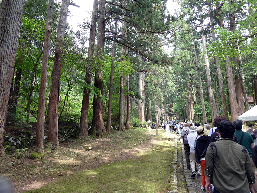福井県内,東京と大阪からの人たちと話をしながら,神事が行われるのを待ち,その後参拝するまでに2時間40分を要した.私たちが並び始めた時の列は,GPDの記録によると約300 mだったけれど,その後どんどん伸びていた.いったいどれくらいになったのだろう.ちなみに前回1992年の時の参拝客は,3日間で14万人強だったそうな.この並びも修行なのかもしれない.(13400 歩)