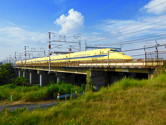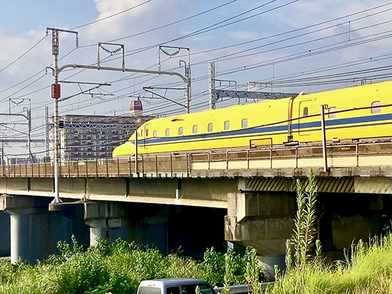 何度も訪れると,次第に勝手がわかり余裕がでてくる.そして,ドクターイエローが東海道本線電車を橋梁名古屋駅側付近で追い抜くことに気づいた.