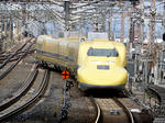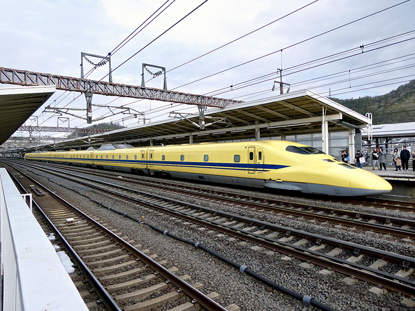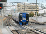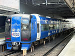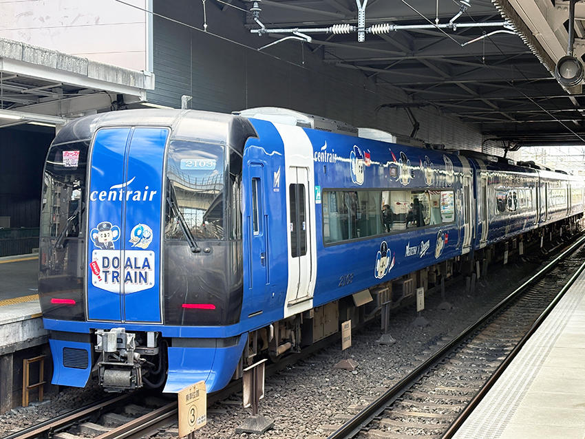 特急ミュースカイの配色を青白反転し,”ドアラ”をラッピングした列車.