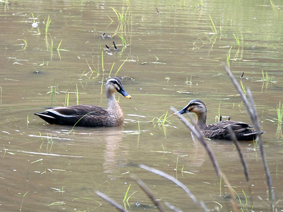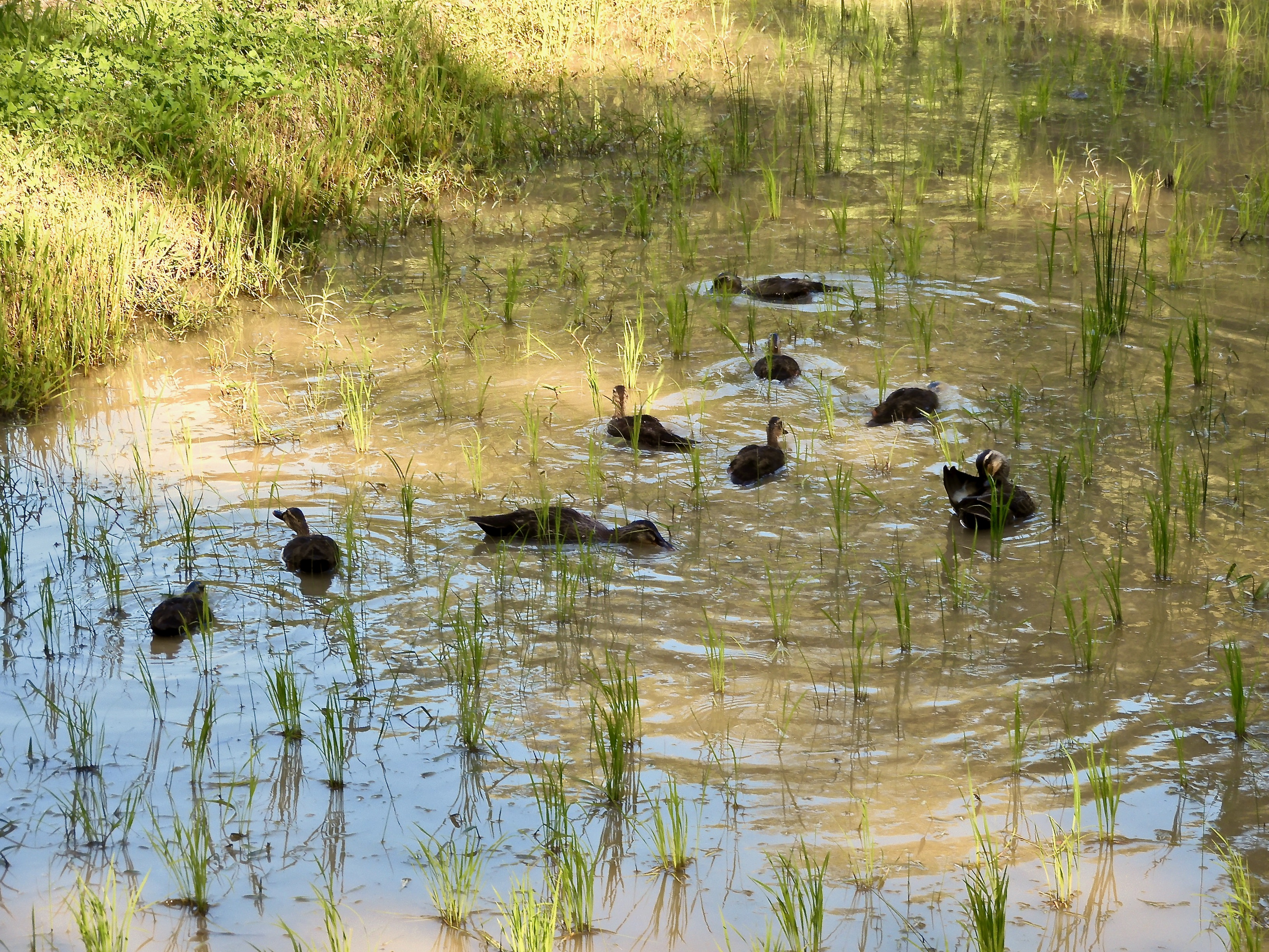 棚田では,カルガモが二羽.餌をついばんでいた.散歩を始めて12年以上になるが,カルガモをみたのは初めて.