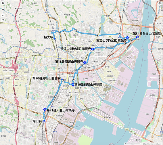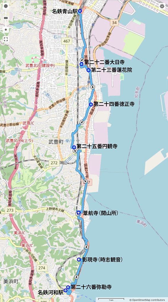 今日は前回のゴール名鉄青山駅 → 第二十二番大日寺 → 第二十三番蓮花院 → 第二十四番徳正寺 → 第二十五番圓観寺 → 葦航寺(開山所) → 影現寺(時志観音) → 第二十六番弥勒寺 → 名鉄河和駅(28300 歩)