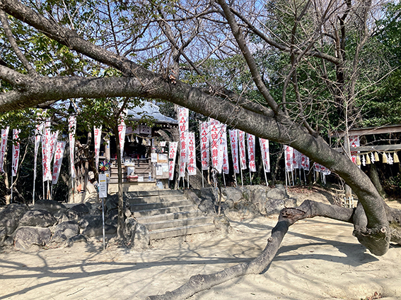 昔は木々が茂った中に鎮座されていたが,今は見晴らしが良くなり,愛知カンツリー倶楽部内にある五合池も見渡せるようになった.