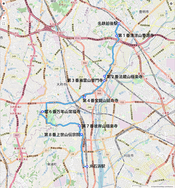 初回は,1番札所の最寄り駅 名鉄前後駅をスタートし,第1番清涼山曹源寺→第2番法蔵山極楽寺→第3番海雲山普門寺→第4番宝龍山延命寺→第6番万年山常福寺→第7番彼岸山極楽寺→第8番上世山伝宗寺の7ヶ寺に参拝し,JR石浜駅がゴールの18.6 km.