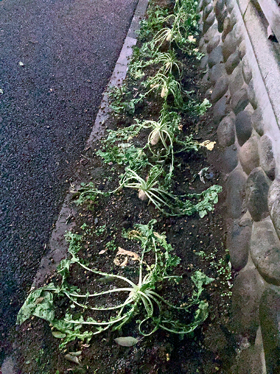 かつての御器所は,御器所大根(萬太大根)の一大生産地でもあった.そして,歴代の尾張藩主が沢庵漬けを手土産にしたことにより世に知られるようになった.これは,大きな家の塀に沿って植えられているのを見ることができた.