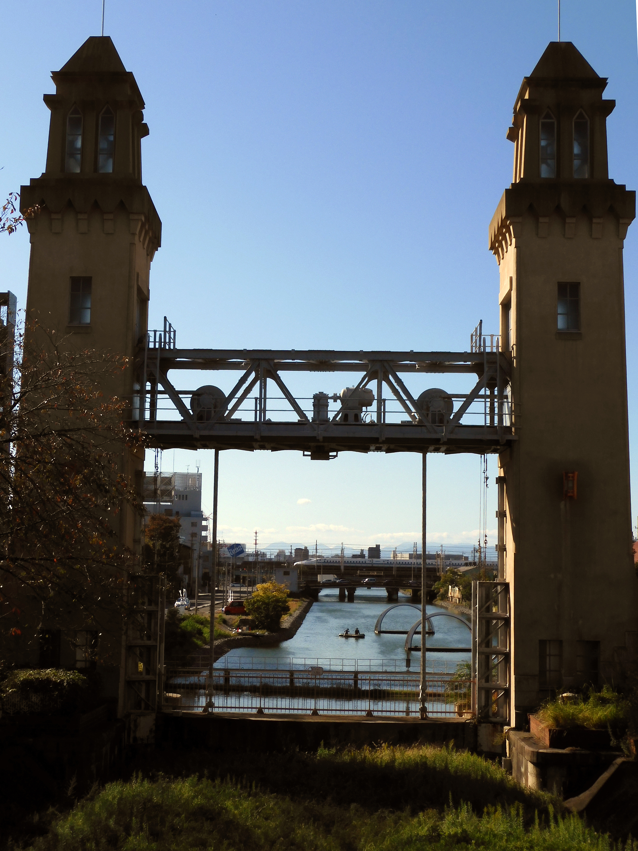 私の好きな眺めは,松重閘門を通してみる,東海道新幹線,東海道本線および名古屋鉄道の車両.