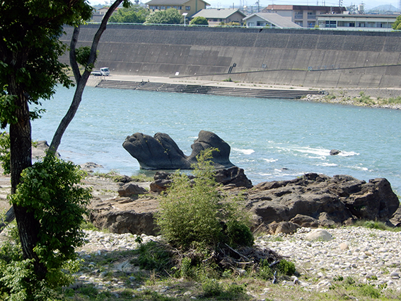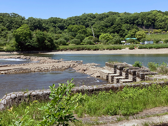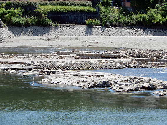 明治用水頭首工の漏水事故のため,それより上流が渇水.水面下にあった明治用水旧頭首工(明治42年竣工)の遺構が顔を出した.