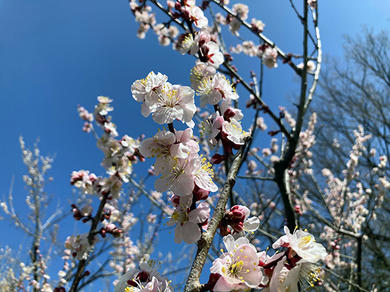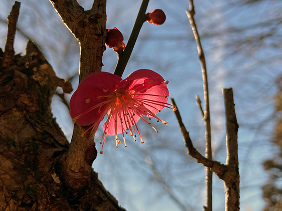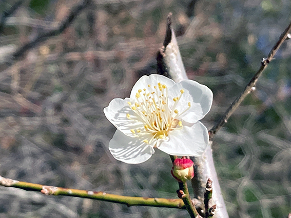 ただ,開花が遅かった1本の梅は7–8分咲き.この梅,他の白梅と異なり僅かに紅色を帯びる.種類が異なるのか,紅白梅のハイブリッドなのか.