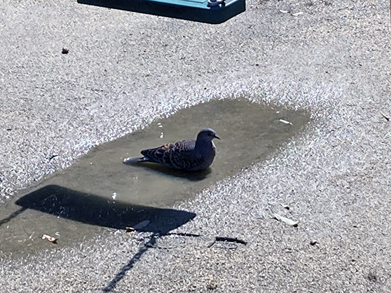 ブランコの下の水たまりでは,ハトが沐浴中(?).