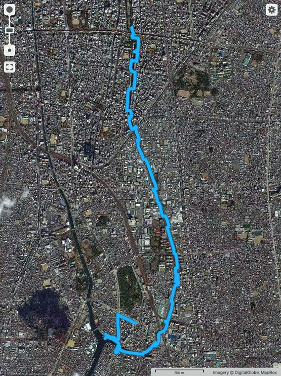 全ての橋を渡りジグザク歩きをしたことや最寄りの駅まで歩いた所為もあるのだろうけれど,GPSは14.3 kmを示していた.私の体感まんざらでもない.