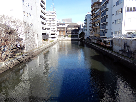 宮の渡し跡で堀川に合流する延長6.0 km.ちょっと短いので,22ある橋をできる限り渡るジグザグ歩きをしてみた.結局,地下鉄駅までを含めて9.1 kmの散歩.