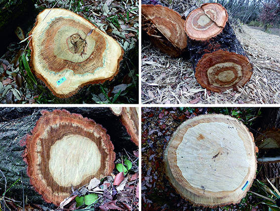 そして,私には不思議に見える年輪を持つ切り株が,少なくとも伐採開始地点から300 m以上にわたって続いていた(前3枚).これは普通のことなのだろうか?緑地の出口あたりではそんな構造は見えない(最後の1枚).樹種の違いなのか,それとも場所が影響しているのか?そもそも,どうしてこんなこんな模様(我々の業界用語では累帯構造と言っても良いか)ができるのか,とにかく久しぶりに面白い観察ができた.