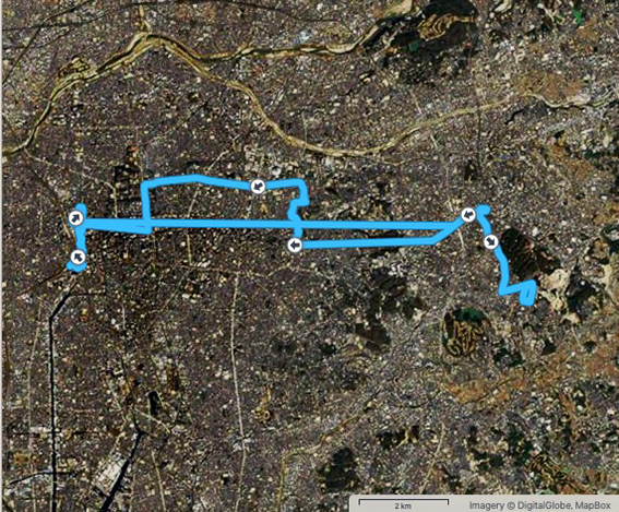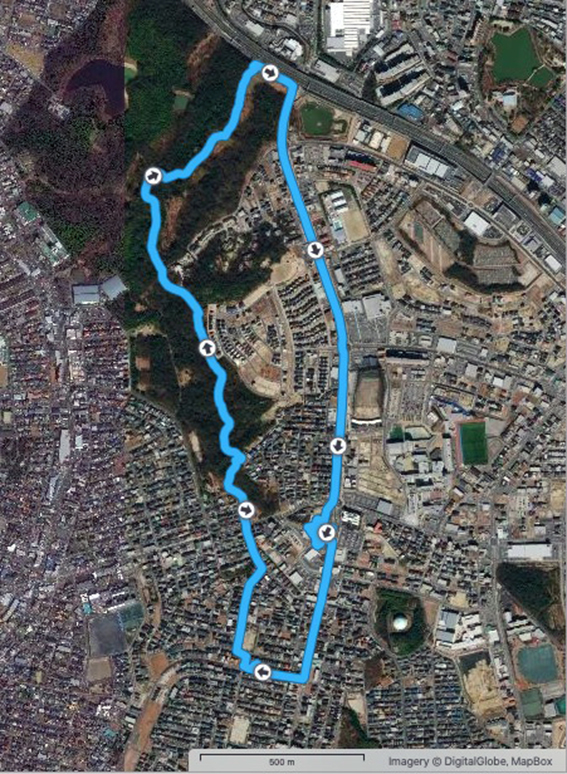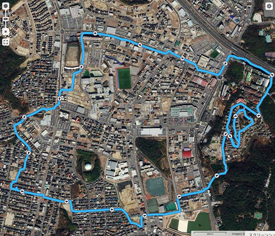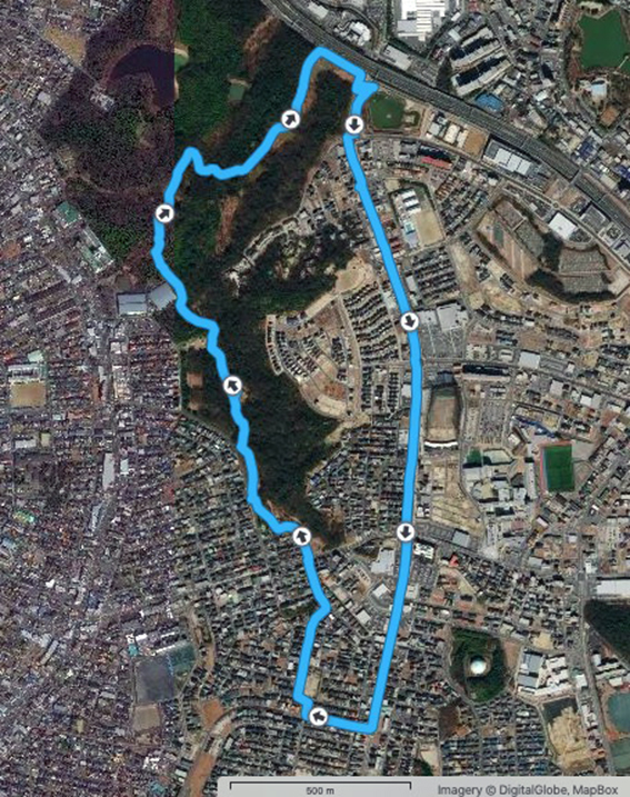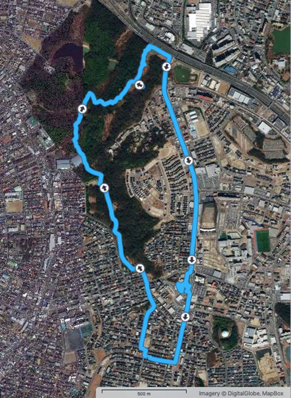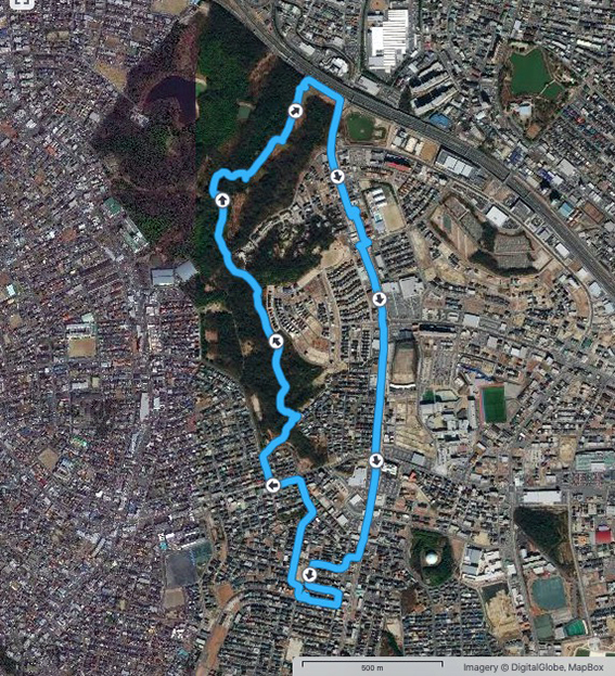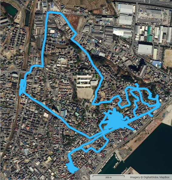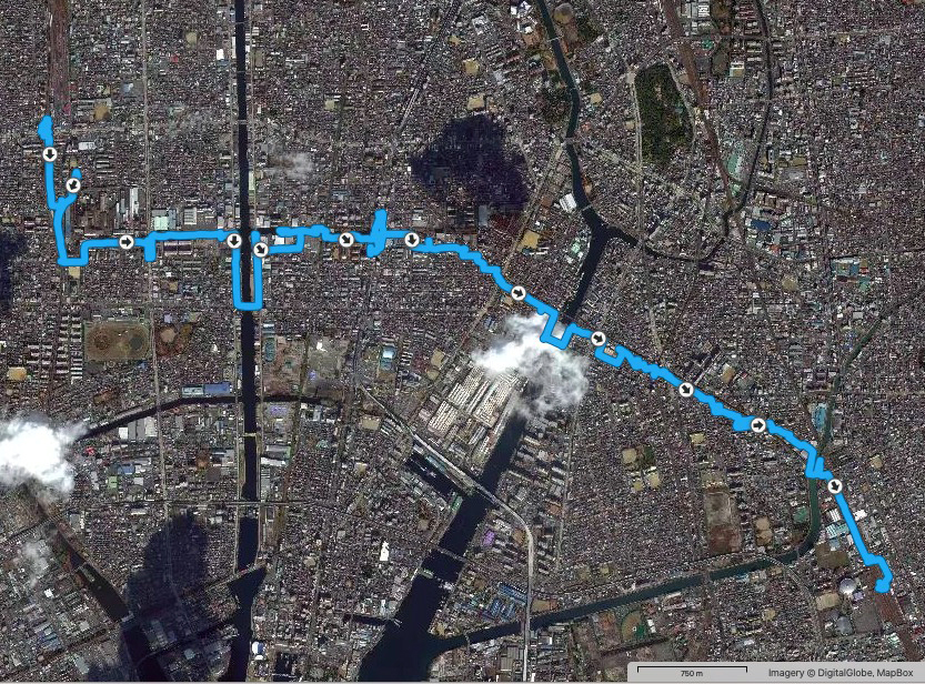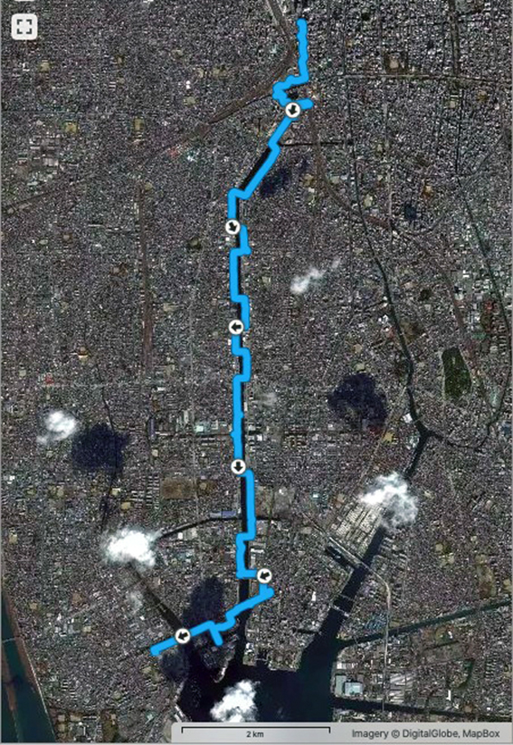 これまでの例だと実歩行距離は少なくともこの2–3割増しになるので,川に沿って一日で名古屋港まで歩くのは難しい.