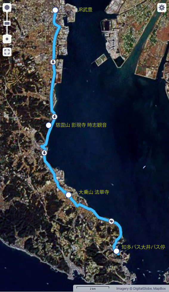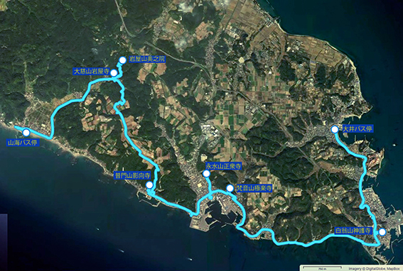 前回のゴール知多バス大井バス停を出発して,第六番白翁山神護寺→第五番梵音山極楽寺→第三番池水山正衆寺→第四番普門山影向寺→第一番大慈山岩屋寺→第二番岩屋山奥之院→海っ子バス山海バス停まで.