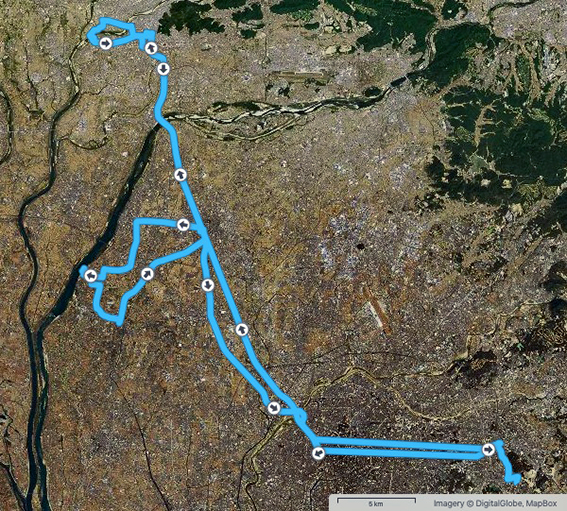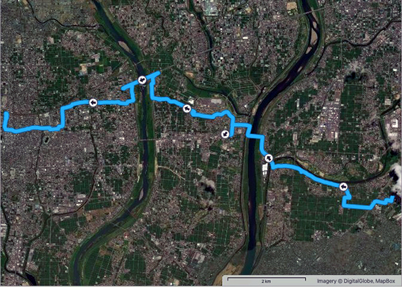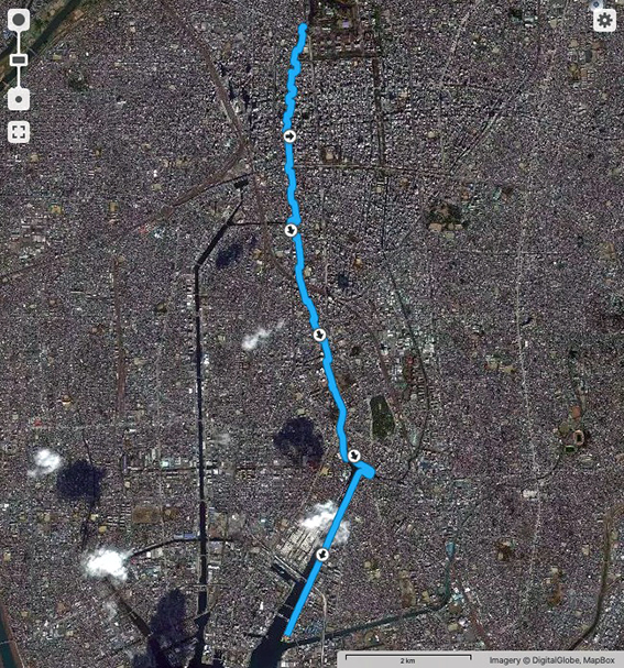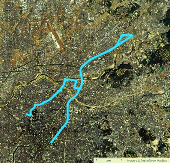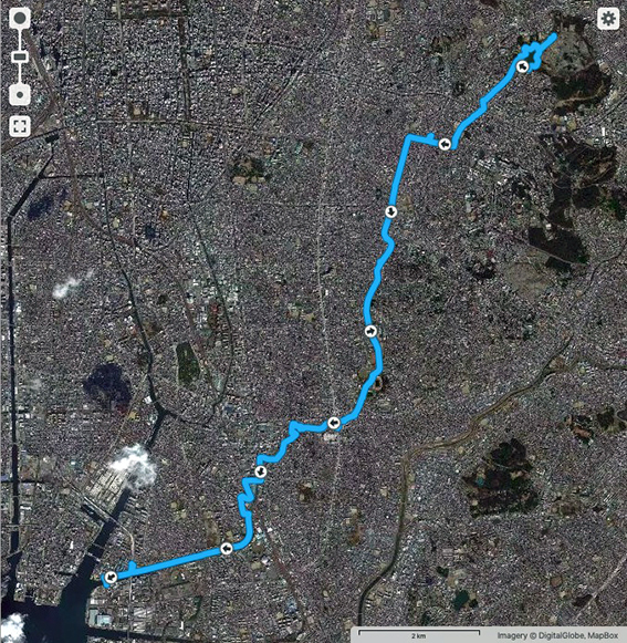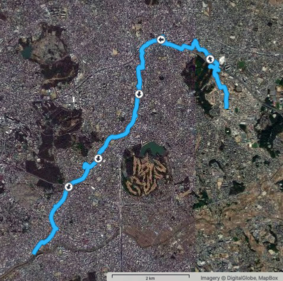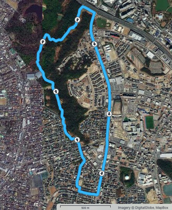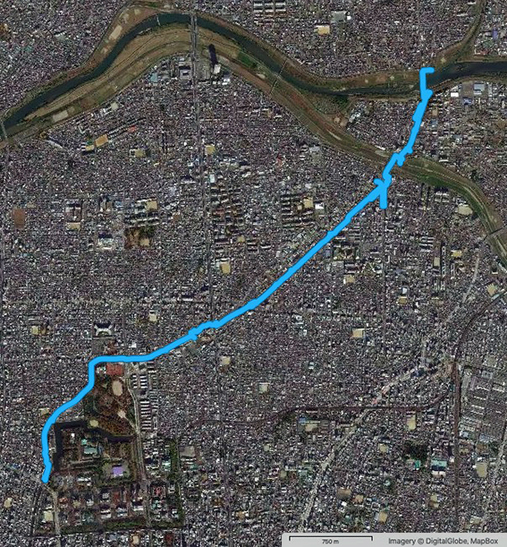 しかし,途中で広い道路や線路などを横切るため,かなり遠方の横断歩道や踏切を迂回しないといけないこともしばしば.