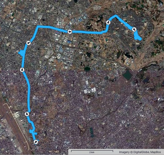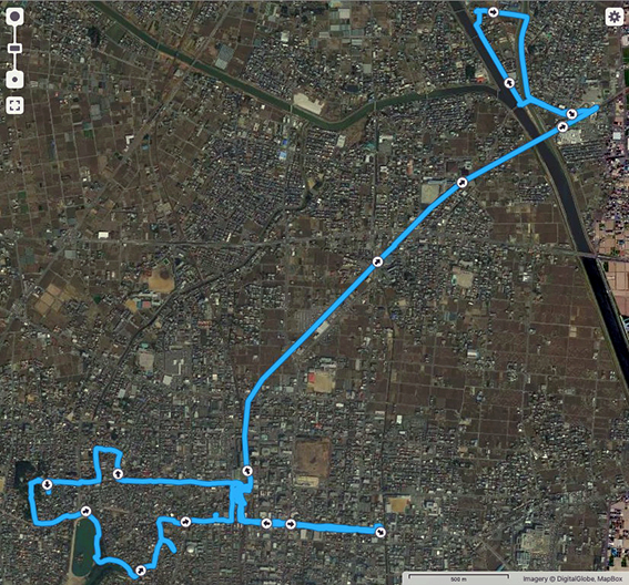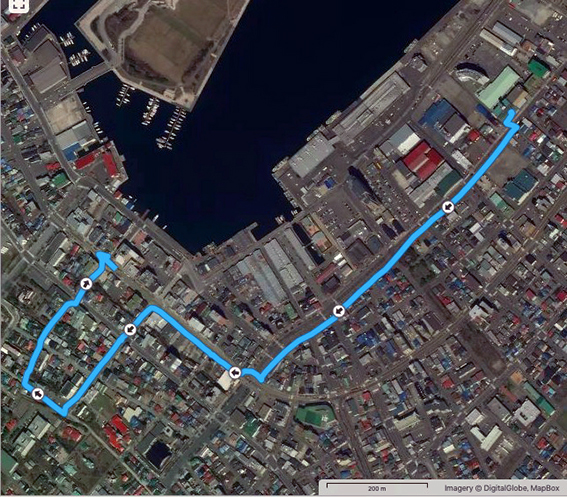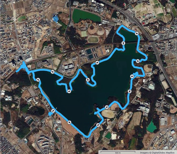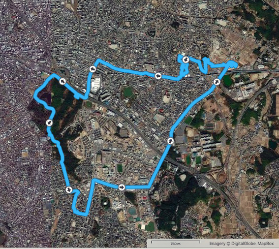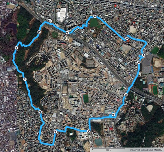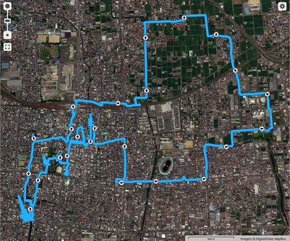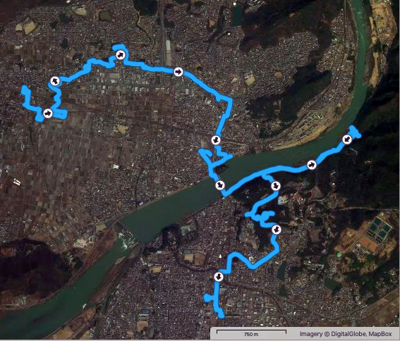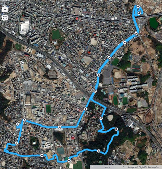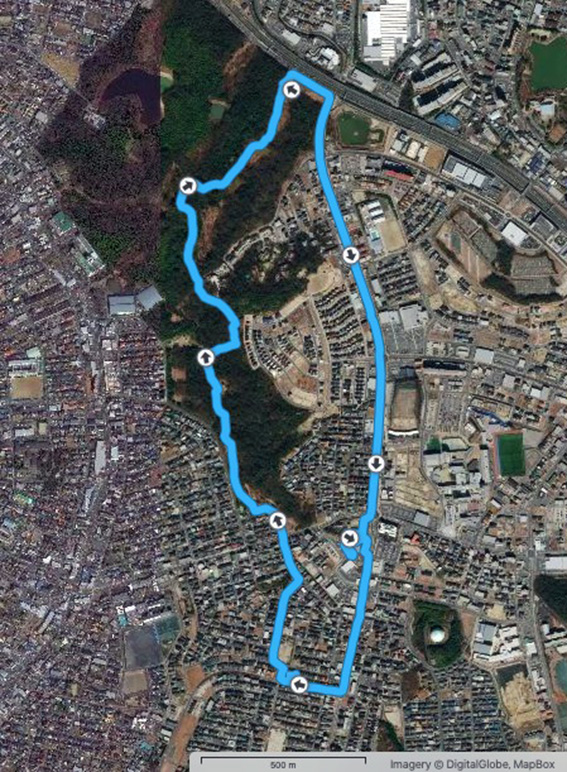 実歩行距離は13.9 km.600mlのペットボトル2本を飲み干し,なんとか当初の予定コースを完歩.