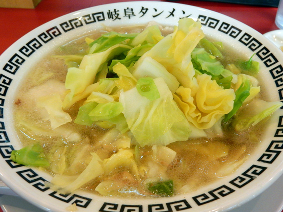 基本的な具材は白菜,キャベツ,豚肉で,ニンニクが入った塩出しスープの,シンプルなタンメン.