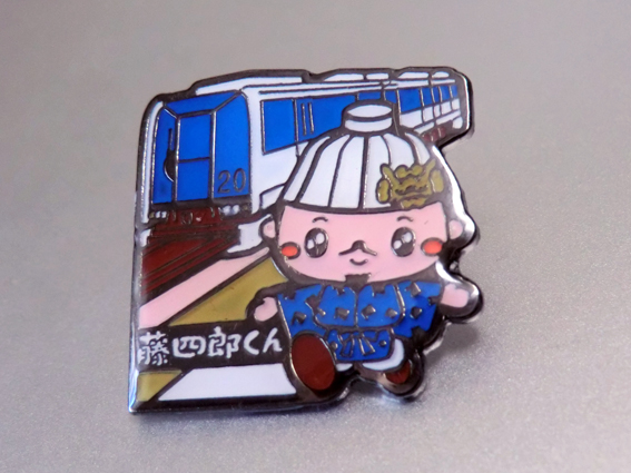 参加賞は,藤四郎くんとリニモがデザインされたピンバッチ.藤四郎くんは,瀬戸焼きの陶祖,加藤四郎左衛門景正がモチーフとなっている.(12900)