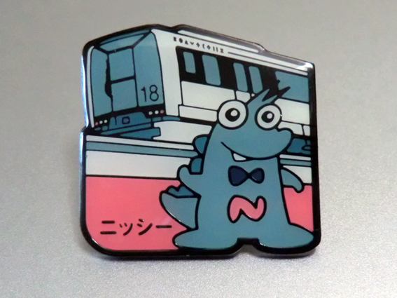 参加賞は,日進市のキャラクター「ニッシー」とリニモがデザインされたピンバッチ.