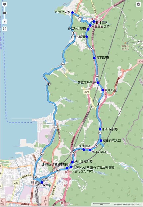 ところで,敦賀駅の南には,1882年に開業し1964年に全線廃止となった柳ヶ瀬線(旧北陸本線)が.長さ1352 mの柳ヶ瀬隧道は,残念ながら徒歩での通過は禁止だが,せめて入口まで辿り着いてみたい.