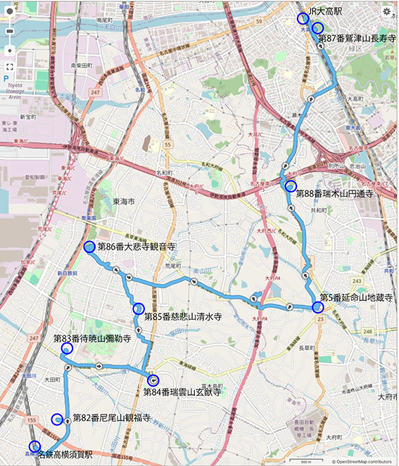 今日は前回のゴール名鉄高横須賀駅 → 第82番尼尾山観福寺 → 第83番待暁山彌勒寺 → 第84番瑞雲山玄猷寺 → 第85番慈悲山清水寺 → 第86番大悲寺観音寺 → 第5番延命山地蔵寺 → 第88番瑞木山円通寺 → 第87番鷲津山長寿寺で結願 その後,JR大高駅から帰途へ