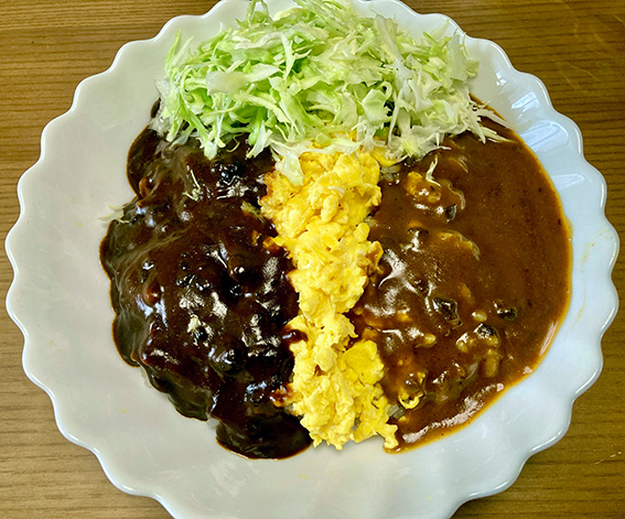 約60年の間にあった紆余曲折で,今では金沢カレーと呼ばれるようになり,その代表であるチャンピオンカレー(右)とゴーゴーカレー(左).それらを食べ比べてみた(半分ずつです).中央のスクランブルエッグは,バリアーのため.
