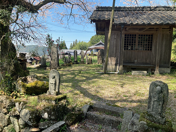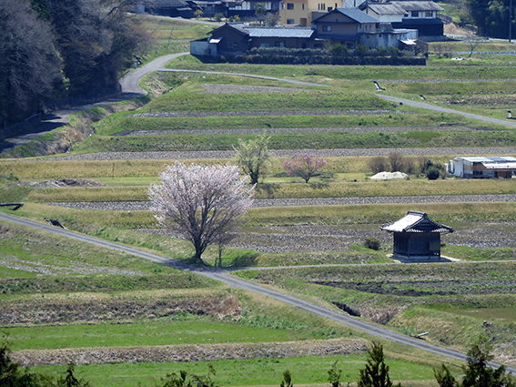 北向地蔵桜:又兵衛桜から少し離れたところにある一本の古木.お地蔵さんの祠に寄り添う桜は,日本の里山の風情.