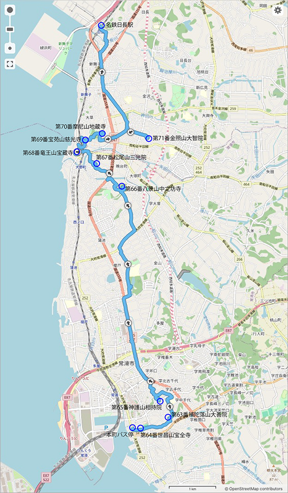 今日は前回のゴール常滑本町バス停 → 第64番世昌山宝全寺 → 第63番補陀落山大善院 → 第65番神護山相持院 → 第66番八景山中之坊寺 → 第67番松尾山三光院 → 第68番竜王山宝蔵寺 → 第69番宝苑山慈光寺 →第70番摩尼山地蔵寺 → 第71番金照山大智院 → 今回のゴール名鉄日長駅