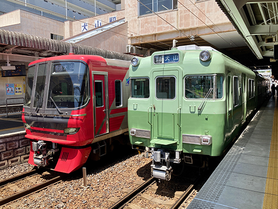 次の特急を待っていると,目の前を今の名鉄には似つかわしくない緑色の電車が通過.調べてみると3400系「イモムシ」をイメージして6000系を復刻塗装した車両らしい.私が乗る特急がこの普通を追いこすことが判ったので,途中の岩倉駅で待ち構え乗り替えてしまった.まったくなにをやっているのやら.