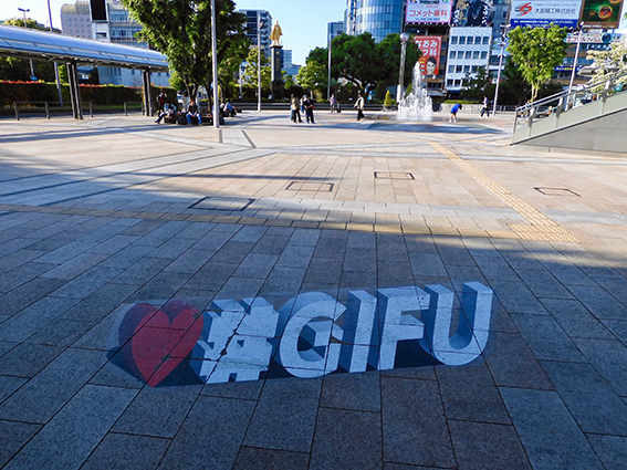 そして,岐阜駅での乗り継ぎ8分を利用して,トリックアートを撮影.元々は3ヵ所あったはずだけれど,1ヵ所は消えたらしく見つからなかった.