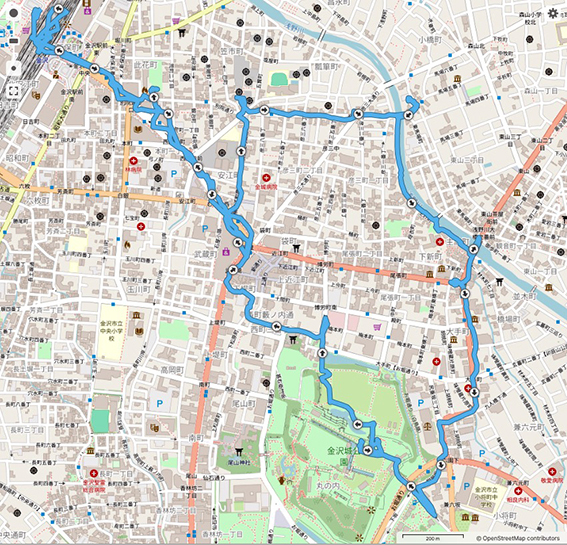 橋場から百万石通り(いつの間にかこんな名前がついていた)を辿り兼六園下へ そして紺屋坂をのぼり、石川門から河北坂、黒門を通り、武蔵が辻から金沢駅へ