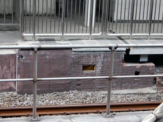 山手線の車中からでも視線が低いので,手前の工事現場が邪魔になって遺構を見ることは全く無理.