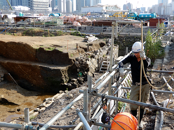 築堤の発掘現場もどこかで見られることを期待したが,ほぼ完全にシートなどで覆われ,一ヶ所から僅かに確認できたのみ.