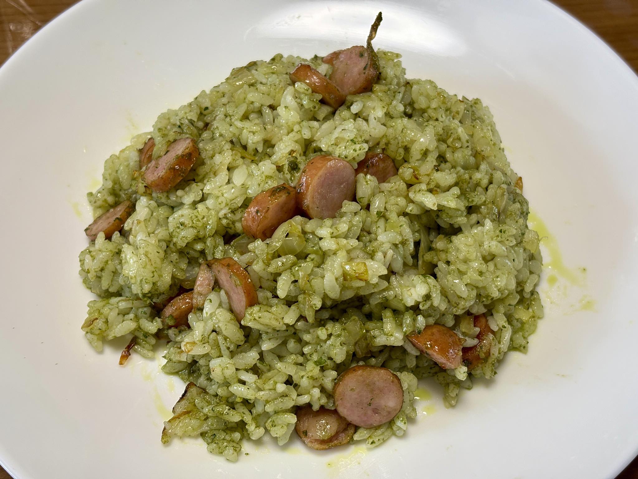 ご飯,ウィンナーと刻み玉ねぎを少量のオリーブオイルで炒める.ジェノベーゼソースはあまり加熱したくないので,火を止めてから入れて軽く混ぜる.以上