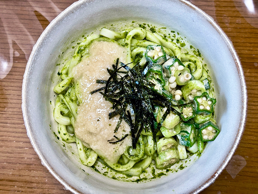 うどんはジェノベーゼソース,オクラはマヨネーズとめんつゆ,長芋はめんつゆで味付け.刻み海苔をトッピング.