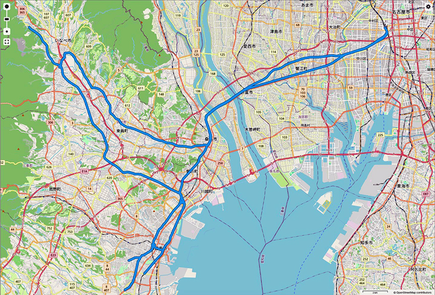 名古屋駅→(JR関西本線 狭軌)→南四日市駅→(JR関西本線)→四日市駅→(徒歩)→あすなろう四日市駅→(四日市あすなろう鉄道内部線 特殊狭軌)→内部駅→(内部線)→日永駅→(四日市あすなろう鉄道八王子線 特殊狭軌)→西日野駅→(八王子線,内部線)→あすなろう四日市駅・近鉄四日市駅→(近鉄名古屋線 標準軌)→近鉄富田駅→(徒歩)→JR富田駅→(徒歩)→近鉄富田駅→(三岐鉄道三岐線 狭軌)→西藤原駅→(三岐線)→伊勢治田駅→(徒歩)→阿下喜駅→(三岐鉄道北勢線 特殊狭軌)→西桑名駅・近鉄桑名駅→(近鉄名古屋線)→近鉄名古屋駅