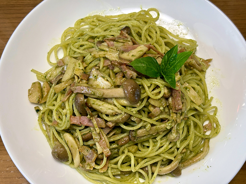 パスタ,バジルソース,ブナシメジ,エリンギ,ベーコン,ニンニク,オリーブオイル.
